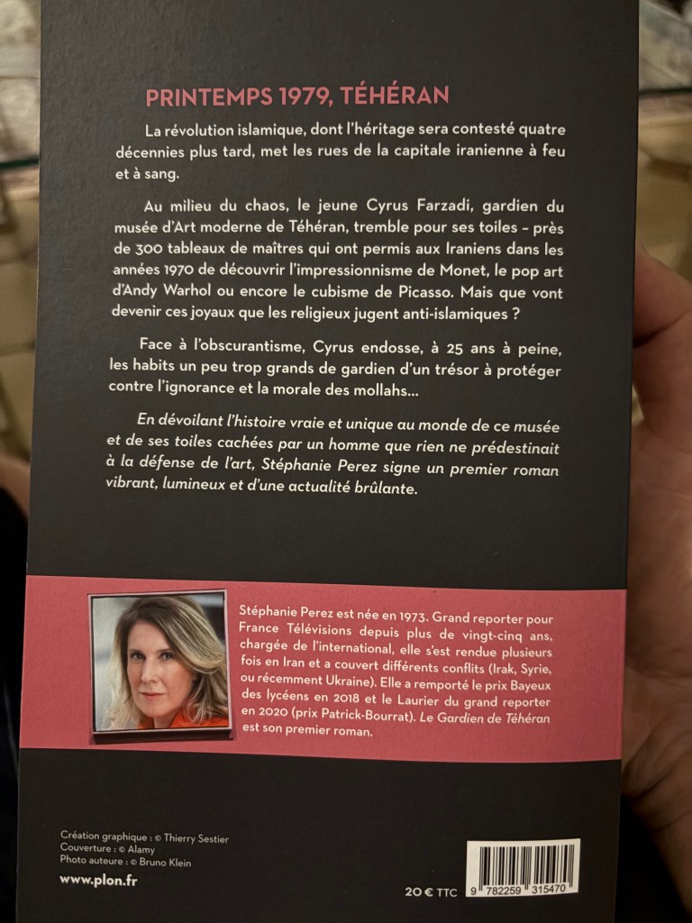 Je viens de terminer Le Gardien de Téhéran de Stéphanie Perez. Ce roman s’inspire d’une histoire vraie — adaptée et romancée pour protéger l’identité des personnes concernées — celle d’un jeune garçon embauché comme chauffeur-livreur pour le futur musée d’art moderne de Téhéran, fondé en 1977 par Farah Diba, l’épouse du Shah d’Iran. Par un enchaînement de circonstances, il devient malgré lui le gardien d’un trésor artistique inestimable : des milliers d’œuvres modernes et contemporaines, qu’il protégera avec une loyauté admirable face à la haine destructrice des mollahs, après la révolution islamique.